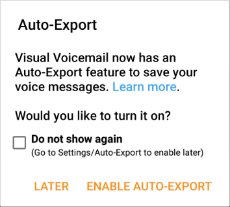 When Auto-Export is enabled, messages in the Archive folder are moved to the Inbox and the Archive folder disappears from the main Visual Voicemail menu. If you disable Auto-Export, the previously archived messages remain in the Inbox, but the Archive folder reappears in the main menu for you to archive messages again.